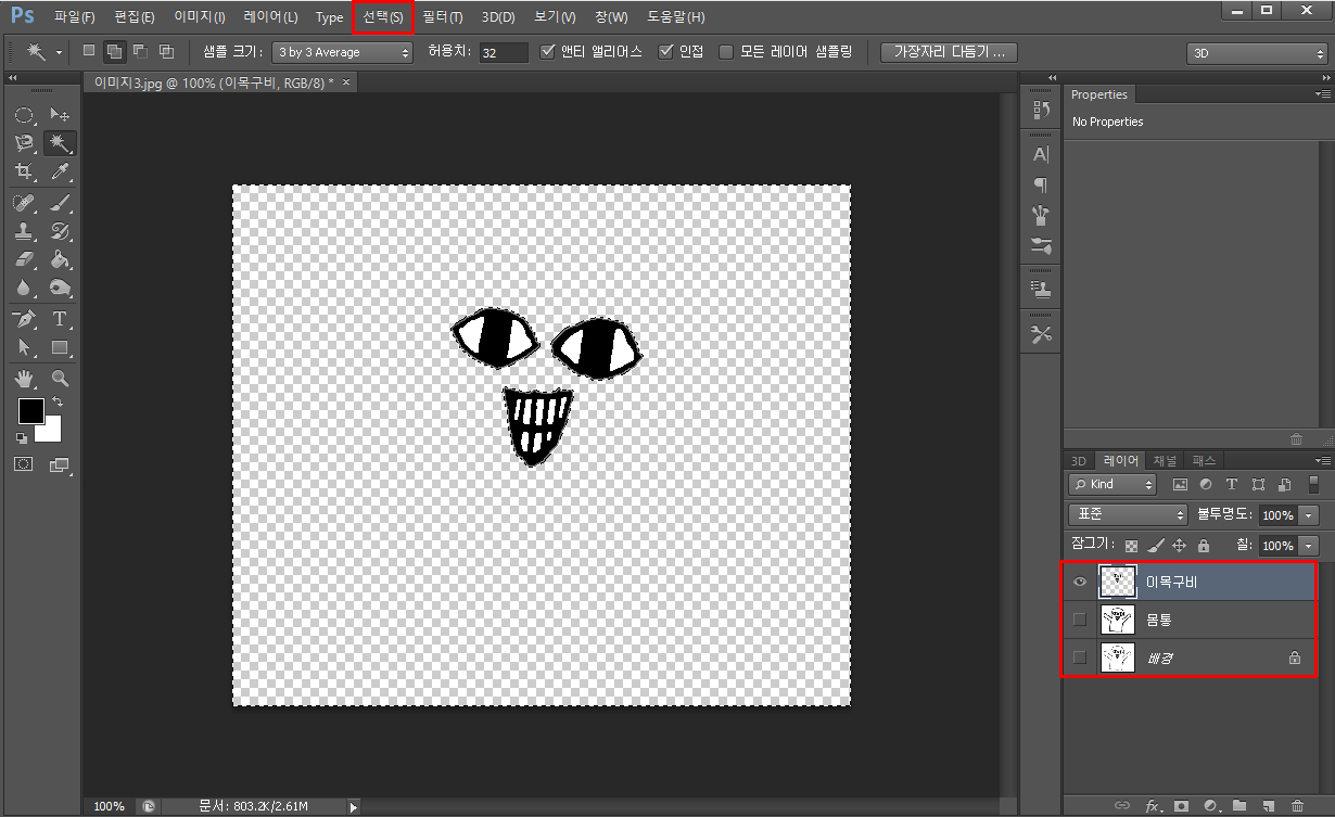 그리고 이목구비 레이어에서 몸통과 배경을 지워준다. 자동선택도구로 영역을 클릭해가며, Delete키로 삭제해주면 된다. 또한 선택을 잘못한 경우에, 가장 상단의 선택창에서 선택 해제를 눌러주면된다.