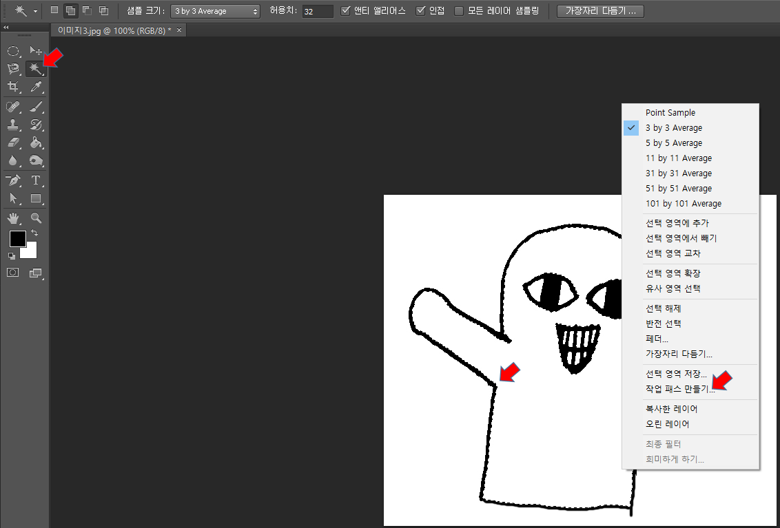 배경 레이어에서 자동선택도구를 클릭한다. 자동선택도구로 이모티콘 몸통를 클릭하면, 몸통의 내부 외곽선을 추출할 수 있다. 그림이 단순하기에 쉽게 영역을 얻을 수 있다. 그리고 이 외곽선을 작업 패스로 만들어야 한다. 마우스 오른쪽 클릭을 하면, "작업 패스 만들기"를 할 수 있다. 또한 옵션을 통해, 작업 패스를 더 부드럽게 얻을 수도 있다.