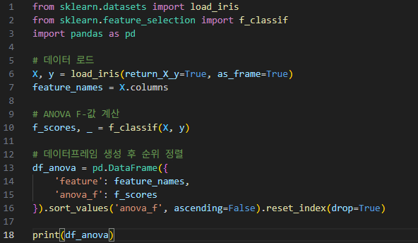 from sklearn.datasets import load_iris from sklearn.feature_selection import f_classif import pandas as pd # 데이터 로드 X, y = load_iris(return_X_y=True, as_frame=True) feature_names = X.columns # ANOVA F-값 계산 f_scores, _ = f_classif(X, y) # 데이터프레임 생성 후 순위 정렬 df_anova = pd.DataFrame({ 'feature': feature_names, 'anova_f': f_scores }).sort_values('anova_f', ascending=False).reset_index(drop=True) print(df_anova)from sklearn.datasets import load_irisfrom sklearn.feature_selection import f_classifimport pandas as pdload_iris : scikit-learn의 Iris (붓꽃) 데이터셋을 불러오는 함수