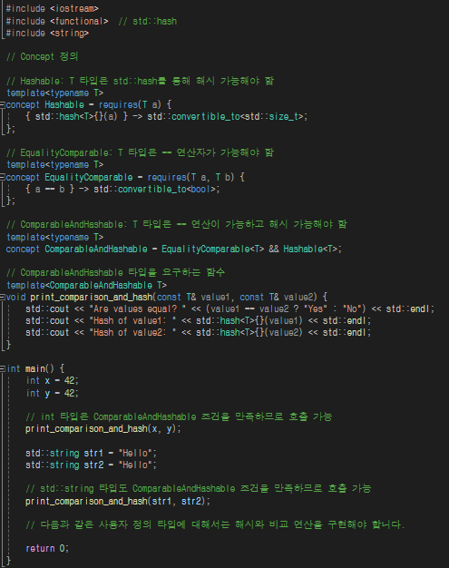 // 사용 예제 3 template<typename T> concept Hashable = requires(T a){ { std::hash<T>{}(a) } -> std::convertible_to<std::size_t; }; template<typename T> concept ComparableAndHashable = EqualityComparable<T> && Hashable<T>;마지막으로 EqualityComparable과 Hashable를 동시에 만족하는 ComparableAndHashable이라는 복함 Concept를 정의하여 사용할 수도 있다.