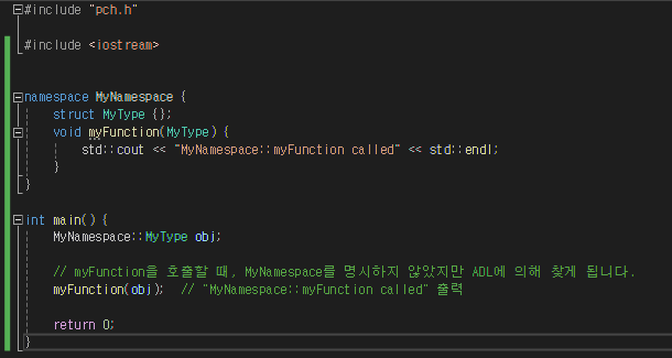 #include <iostream> namespace MyNamespace { struct MyType {}; void myFunction(MyType) { std::cout << "MyNamespace::myFunction called" << std::endl; } } int main() { MyNamespace::MyType obj; // myFunction을 호출할 때, MyNamespace를 명시하지 않았지만 ADL에 의해 찾게 됩니다. myFunction(obj); // "MyNamespace::myFunction called" 출력 return 0; }위 코드에서 MyNamespace 내 구조체인 MyType 형태로 obj를 정의했다. 그리고 MyNamespace 안의 함수인 myFunction에 함수 인자 obj를 넣을 경우, myFunction 함수에 추가적으로 네임스페이스를 명시하지 않더라도 자동으로 obj가 속한 네임스페이스에서 해당 함수를 검색해준다.
