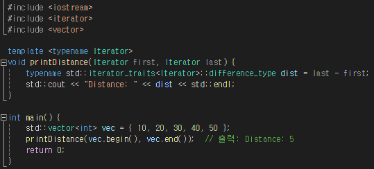 위 예제에서 std::iterator_traits<Iterator>::difference_type은 전달된 반복자 타입에 맞는 difference_type를 추론하는데 사용된다. std::iterator_traits는 반복자의 특성을 추출할 때, 사용되는 템플릿 클래스다. difference_type은 반복자 간의 거리를 나타내는데 사용된다.